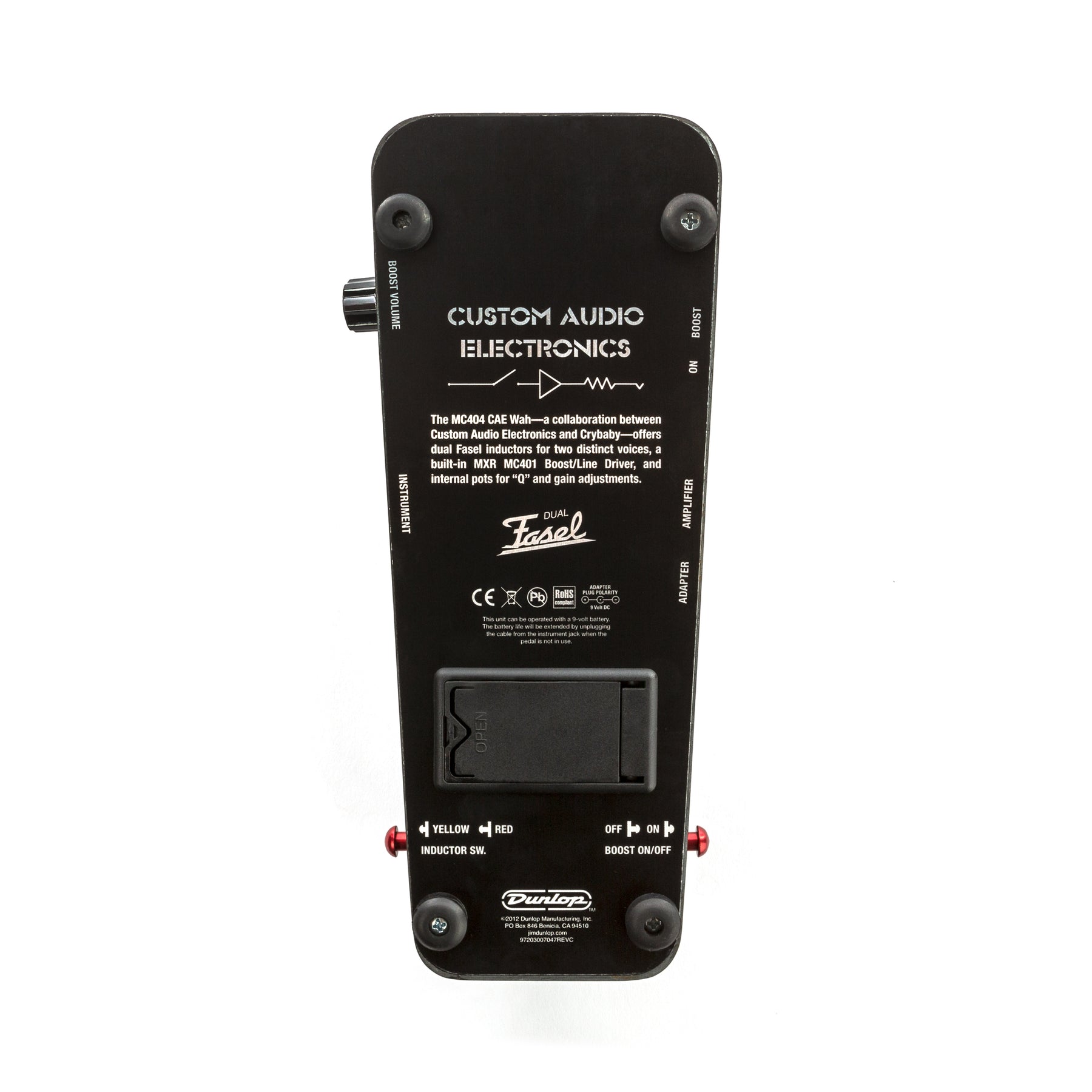 The MC404 CAE Wah was developed by Bob Bradshaw of Custom Audio Electronics and the Cry Baby design team with the goal of creating a highly versatile wah-wah of top-grade components. It features dual Fasel inductors with two distinct voices (high-end emphasis or low to mid resonance), and a built-in MXR MC401 Boost/LineDriver adds even more flexibility. Choose between inductors and turn the boost on or off with the side-mounted kickswitches; bright LEDs on each side of the wah indicate operation status. The MC404 boasts true hardwire bypass, a long-life CTS potentiometer, and internal pots for "Q" and gain adjustments.