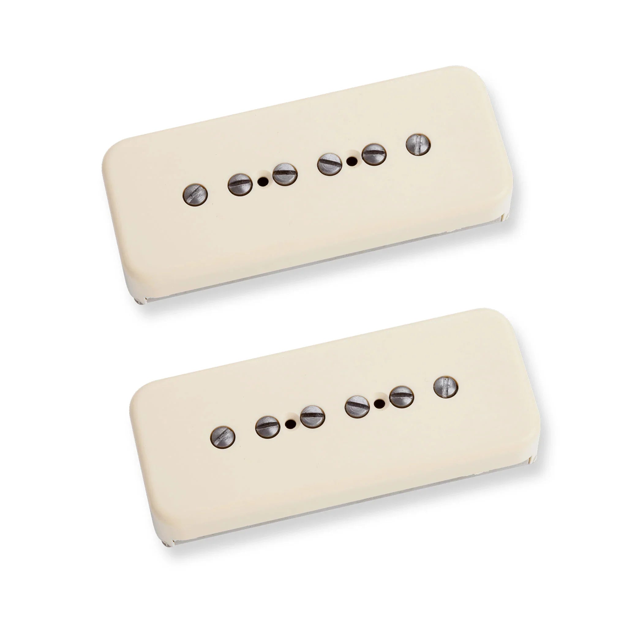 Our Antiquity P90 Dog Ear pickups use two specially calibrated alnico 2 bar magnets, and custom neck and bridge coil winds to deliver the sweet, vintage correct growl of late 50s ES-330 P90 pickups. In the neck position, chords are full and round sounding, and single notes have a sweet, bouncy quality. In the bridge, chords have a gritty, honky midrange, and single notes are nice and articulate without sounding harsh. The neck pickup is also wound RW/RP to be hum-cancelling when paired with the bridge position model. If you remove our hand aged dog ear cover, you’ll find the same hand fabricated bobbin, plain enamel mag wire, and flatback tape that was made in Kalamazoo during the early days. These pickups are drop-in replacements for any standard Gibson P90 Dog Ear sized route, and come with aged black covers.